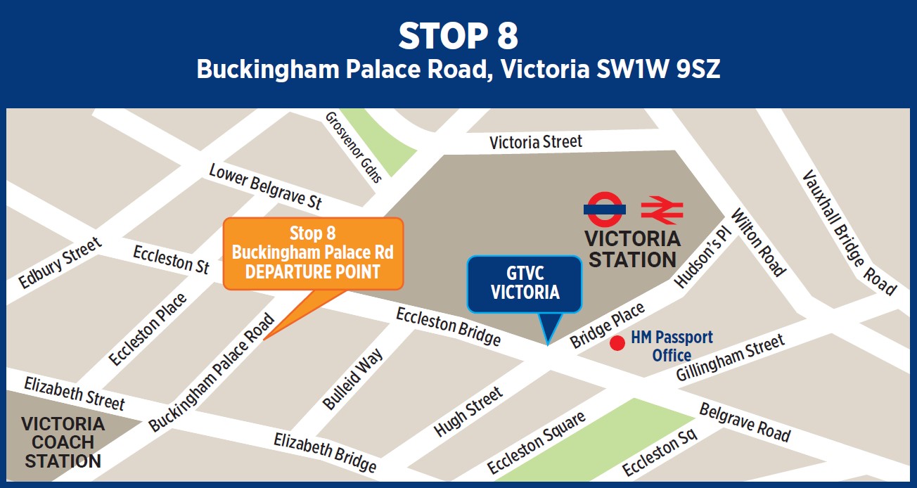 出发地点:Buckingham Palace Road, Victoria SW1W 9SZ 8 号巴士站
